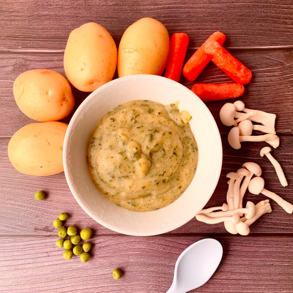 Ingredients: halibut, carrot, pea, mushroom, potato.